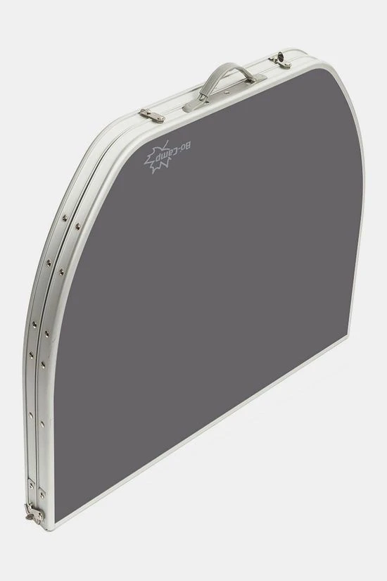 De Bo-Camp Tafel Ovaal Koffermodel 150×80 cm is een zeer stabiele ovalen campingtafel. Deze tafel heeft verstelbare poten, stelschroeven voor extra fijnstelling en een deelbaar tafelblad. Hierdoor is de tafel eenvoudig op te vouwen tot koffermodel (80 x 60 x 7 cm). De poten zijn in drie verschillende hoogtes verstelbaar (55, 65, 70 cm). De tafel is gemaakt van lichtgewicht aluminium. Onder het tafelblad is een net bevestigd om spullen op te bergen.
