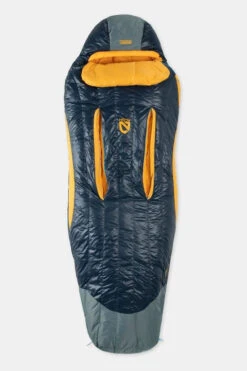 - De capuchon is open en de slaapzak is voorzien van een doorlopende tweewegrits voor eenvoudige ventilatie. Een gewatteerde flap langs de rits houdt de tocht buiten.