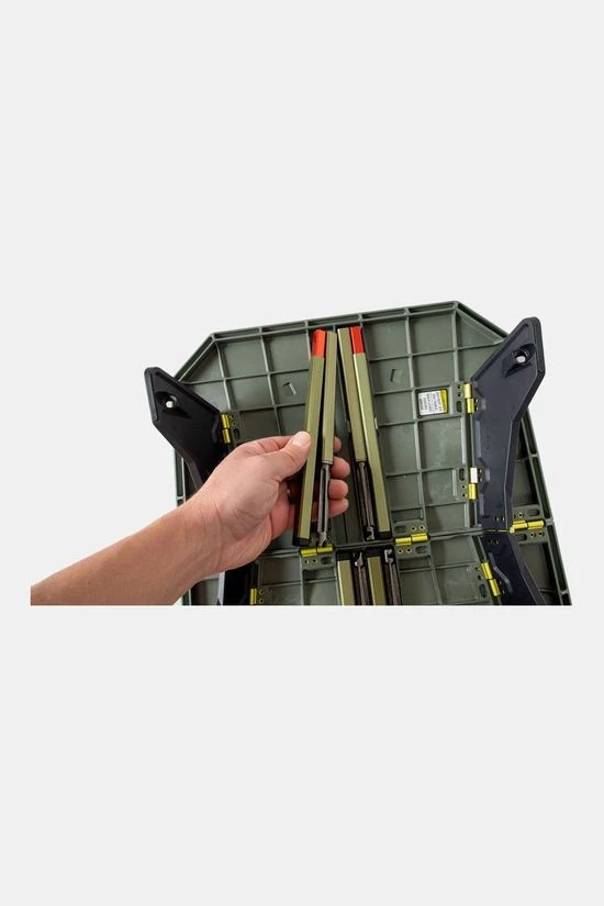 - Wanneer niet in gebruik, kunnen de poten in een opbergruimte aan de onderkant van de tafel worden vergrendeld voor een opgeruimde opberging.