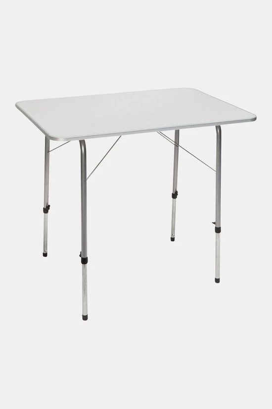 Deze in hoogte verstelbare campingtafel 80×60 cm van Camp-Gear is zeer compact. Deze tafel beschikt over een stalen frame en vier poten die traploos verstelbaar zijn van 50 tot 70 cm. De verstelbare poten zijn afzonderlijk af te stellen zodat de tafel op iedere ondergrond stabiel staat. Daarnaast is het tafelblad beter bestand tegen water door de dicht gesealde randen en de aluminium stootrand. Ingeklapt heeft deze Camp-Gear tafel een afmeting van 80 x 60 x 7 centimeter.